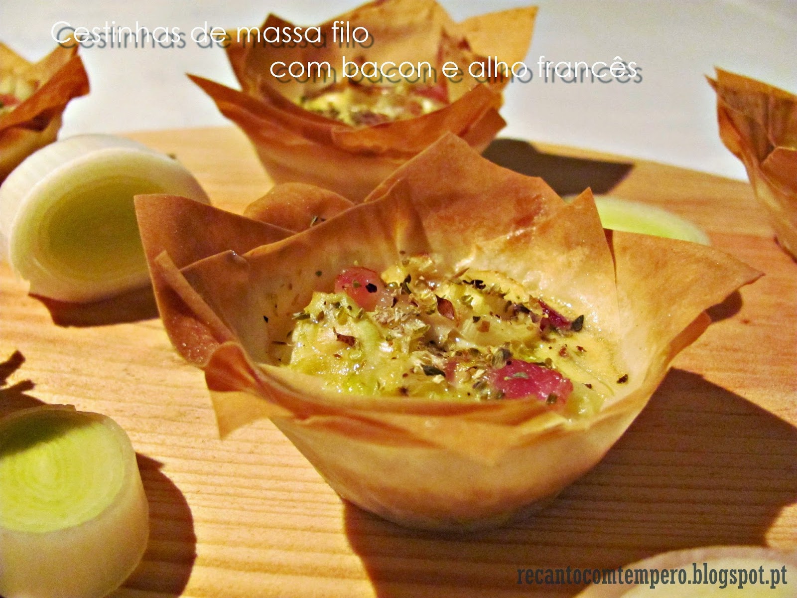 . Pincele as folhas de massa filo com um pouco de azeite e corte-as em pequenos quadrados. Sobreponha 3 quadrados de massa filo e forre formas de queque para fazer as cestinhas. Rende cerca de 10 cestinhas dependendo do tamanho das formas.