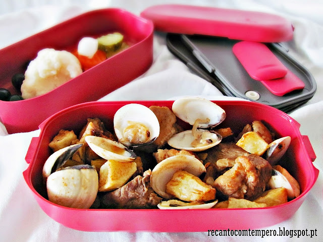 Carne de porco a alentejana foi um dos primeiros pratos que fiz sozinha! Essa marmita foi apetrechada com uma refeição deliciosa! Beijinho