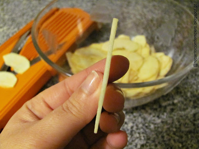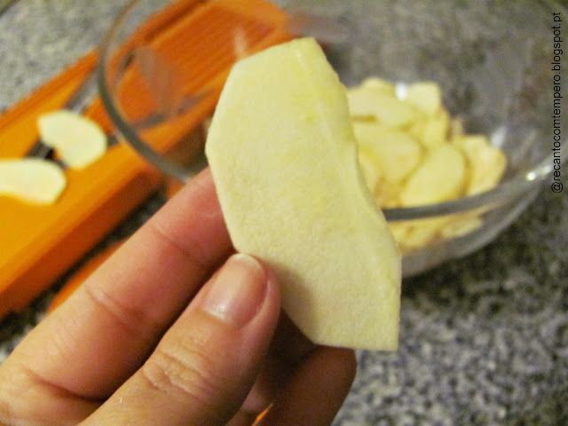 - Lave e descasque as maçãs. Abra-as ao meio e retire o caroço. Com a ajuda de uma mandolina, corte as maças em fatias "meia lua" bem finas.