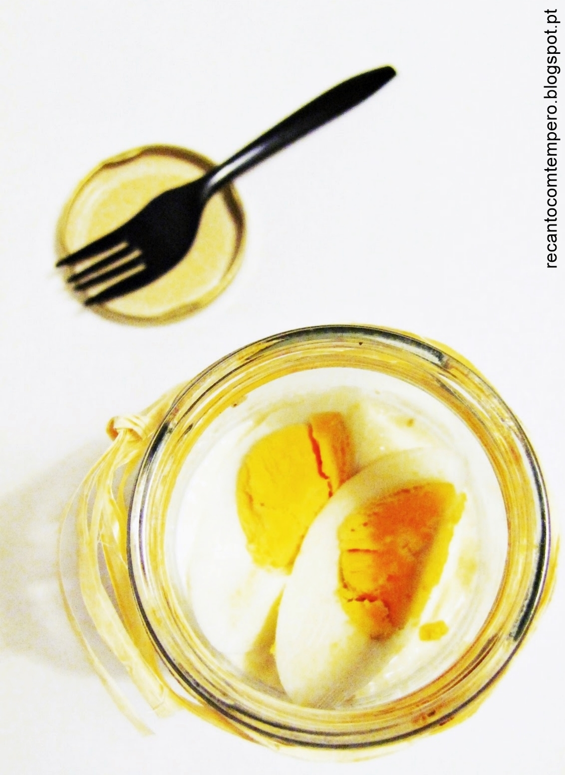 Num frasco, coloque pela seguinte ordem: grão-de-bico, atum, maionese e ovo.