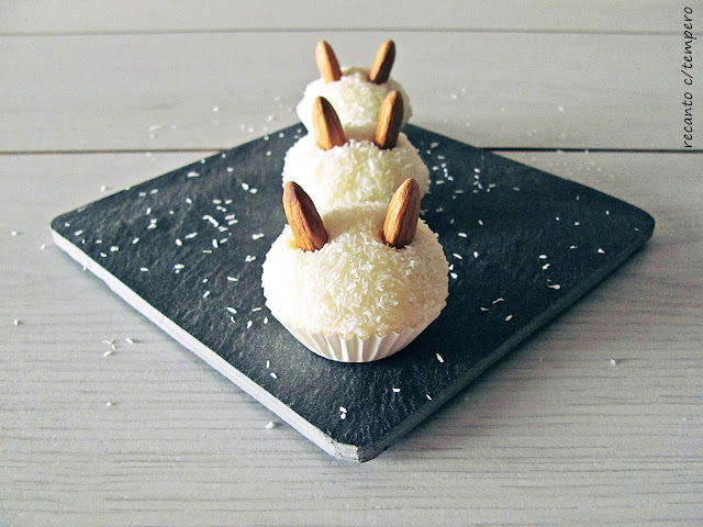 A minha versão leva apenas 3 ingredientes e roubou muitos sorrisos a quem provou 😉 Aproveitei a época Pascal que se avizinha e decorei estes beijinhos com amêndoas, simulando as orelhas do "Coelho da Páscoa".
